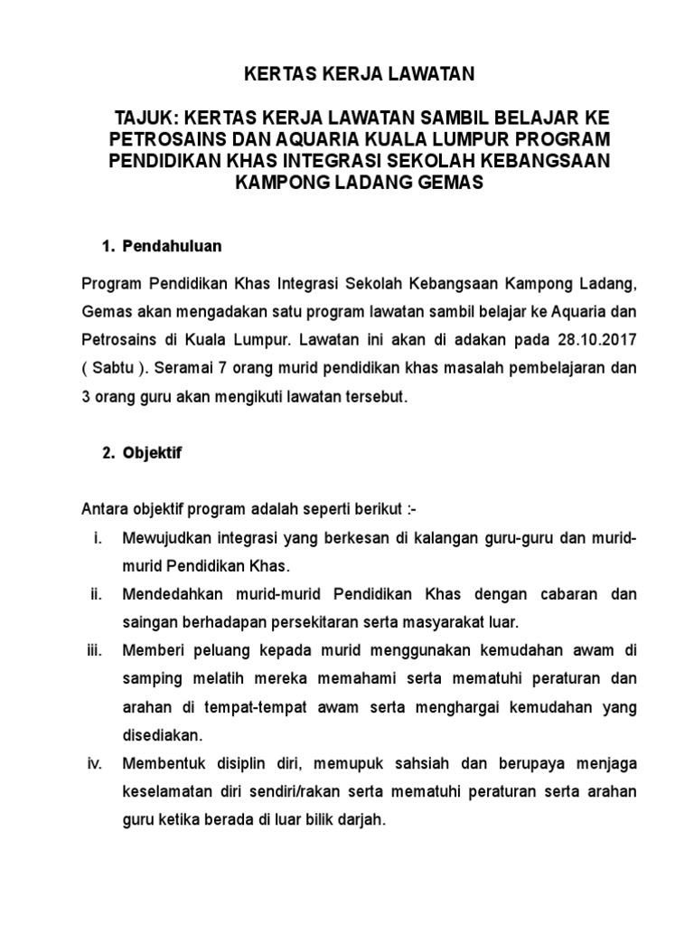 Doc Kertas Kerja Cadangan Lawatan Sambil Belajar Program Pendidikan Khas Integrasi Ke Cameron Highland Zanina Zaki Academia Edu