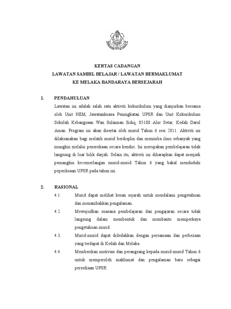 PENDAHULUAN Lawatan ini merupakan salah satu daripada teknik pengajaran dan pembelajaranPdP sangat memberi impak mendalam kepada murid-murid. Sk semayan banggi peti surat 319 89058 kudat sabah kertas cadangan lawatan. Institut latihan perindustrian sandakan jabatan tenaga manusia kementerian sumber manusia kertas cadangan nama program.