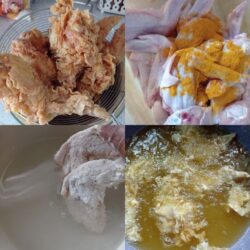 Satukan bahan-bahan bertanda. Keluarkan ayam dari campuran mentega susu tambahkan ayam ke dalam tepung. Siram dengan jeruk taburkan garam dan balurkan ke seluruh bagian ayam.